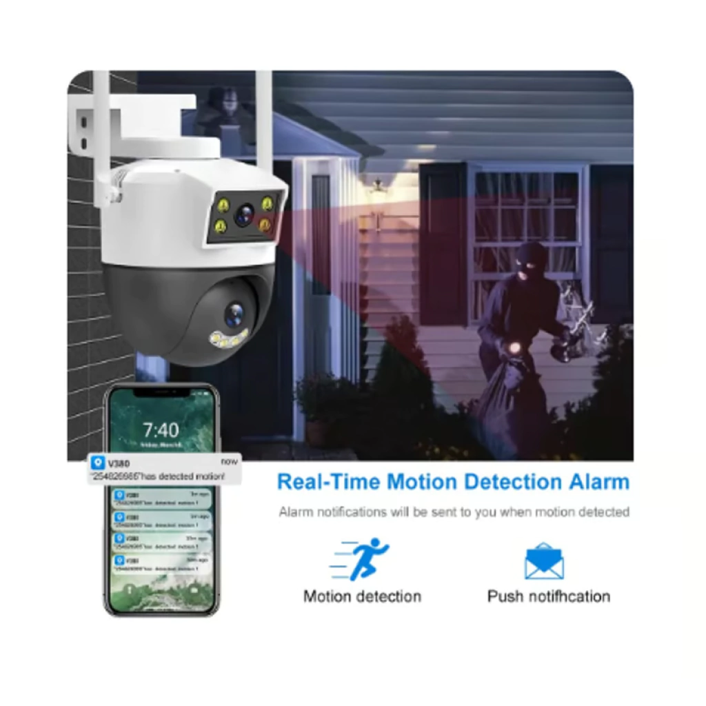 La detección de movimiento permite el seguimiento automático del movimiento del cuerpo, asegurando que nada se escape de tu vigilancia. Recibe alertas instantáneas a través de la función de push de cliente de teléfono móvil cuando se detecte actividad.